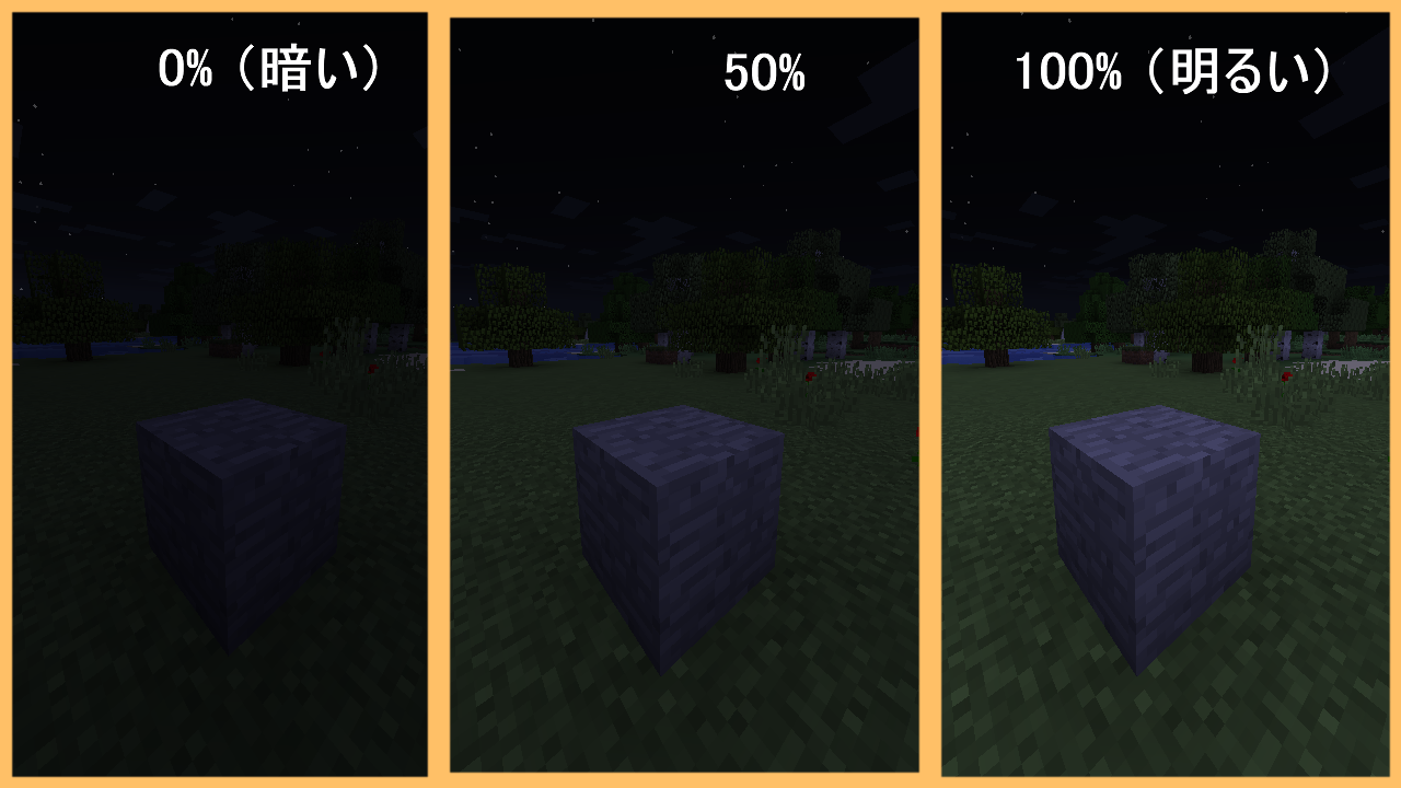 村の外なので適当でも良いですが、村の中がそうならないようにしっかりと確認しておきましょう。 ちなみに画面の明るさを設定する手順は、マイクラのプレイ画面から、 Escキーを押す 設定 をクリック ビデオ設定をクリック 明るさのバーを左右に操作 完了 これで出来ます。 ちゃんと湧き潰ししているはずなのにどこからか敵が出てくる! という方は一度画面を暗くして9月 (31) 8月 (8)マイクラでは、明るさが7以下のところにモンスターが沸く仕様になっています。 なので基本的には、松明を敷き詰める等のモンスター沸き潰し作業が必須になるよね。 ちなみに松明は明るさレベル14を持ち、グロウストーンやシーランタン等はレベル15を持ってます。 それと溶岩や炎にも明るさレベルが設定されていて、最大レベルの15設定。 そういうのを光源として役立てるのもオシャレだよな